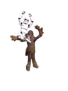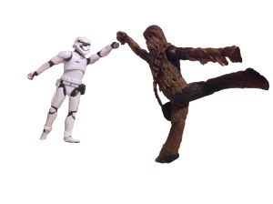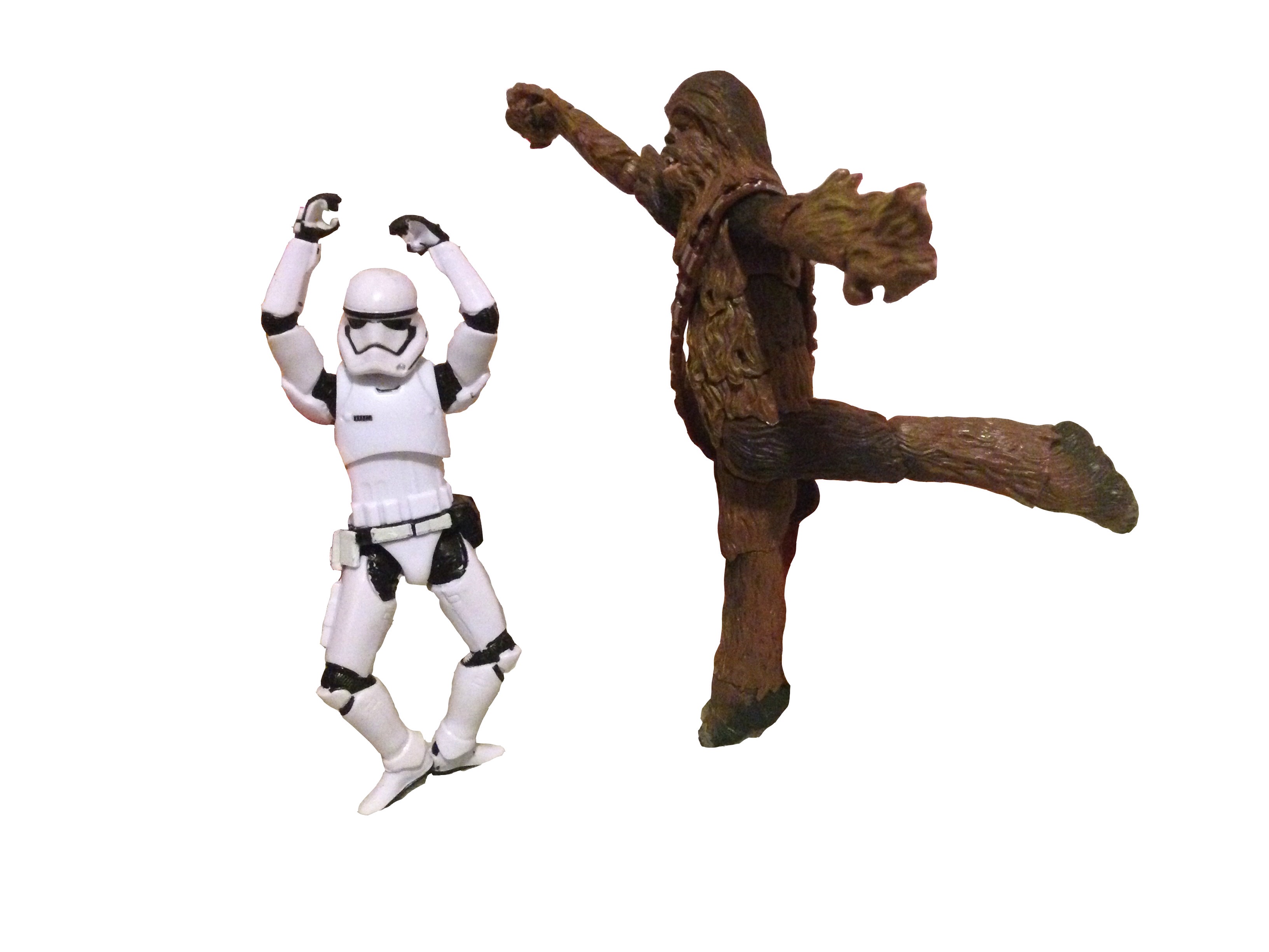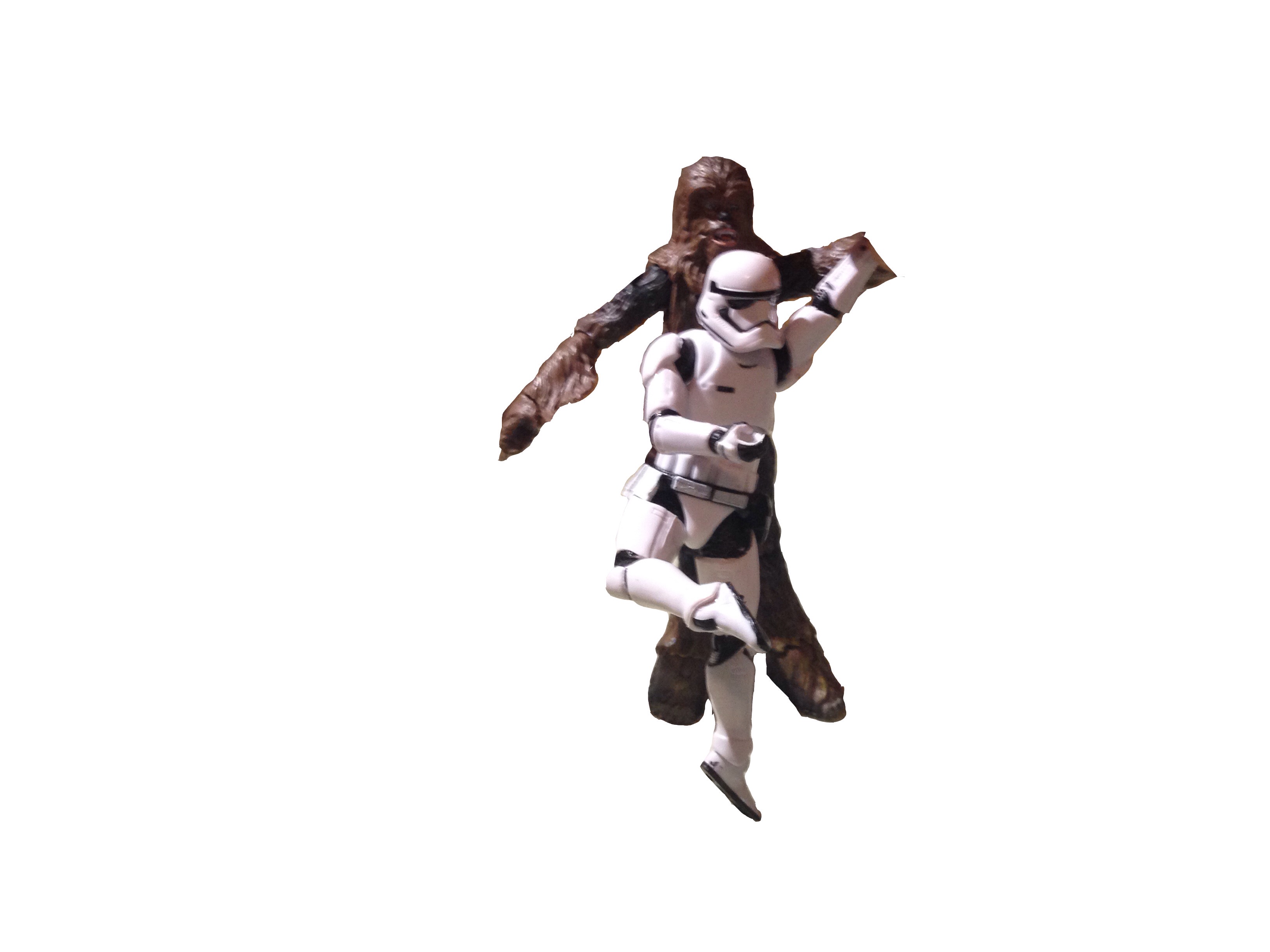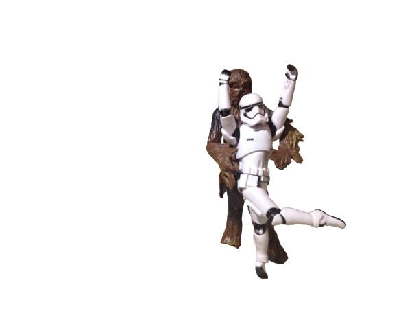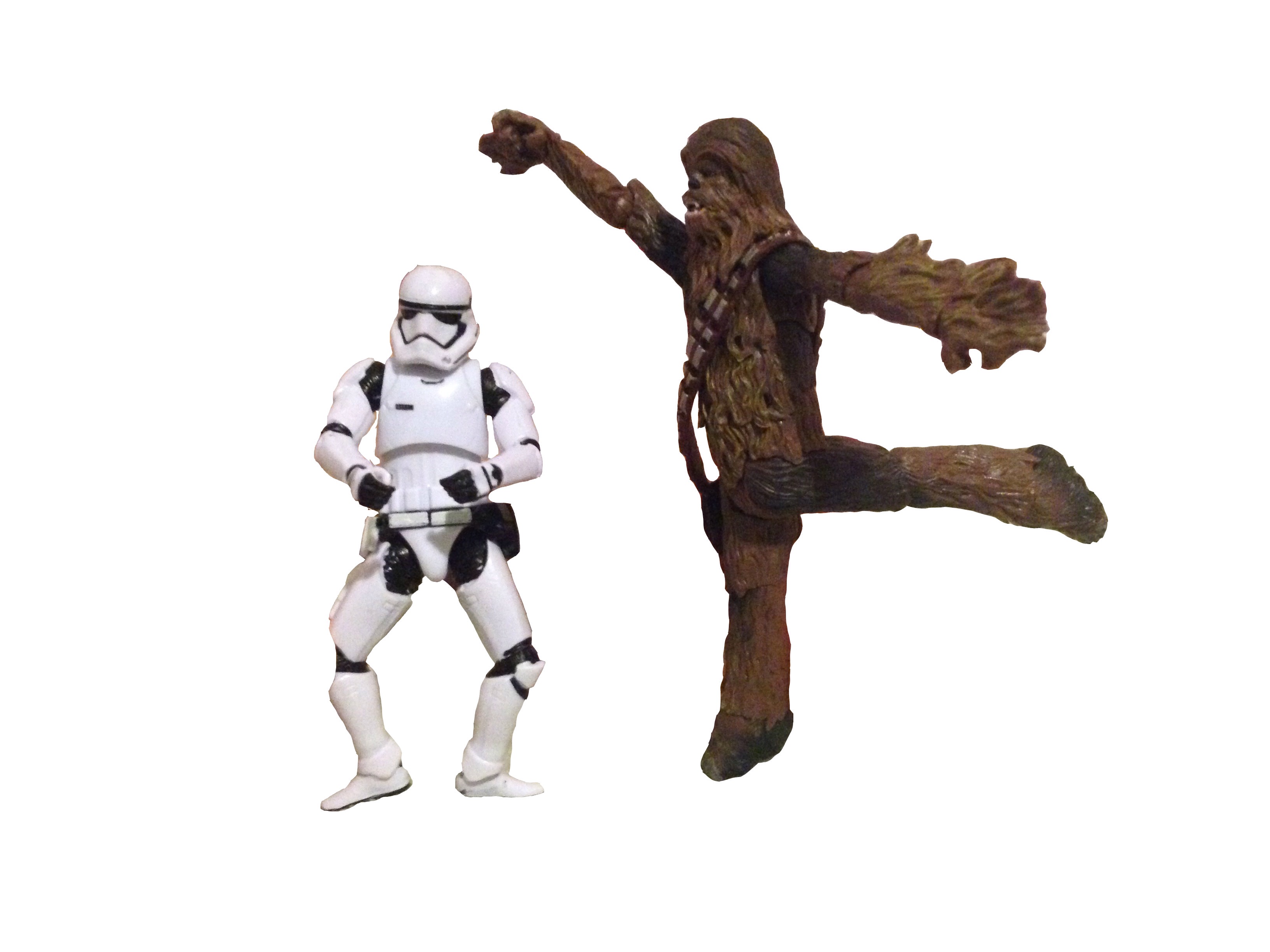 It turns out that The Forces Awakens Black series’ joint articulation is pretty decent, and despite my daughter’s need to go to bed, I was quickly sucked into posing the Stormtrooper properly. One thing led to another, and I added Chewbacca to the choreography: